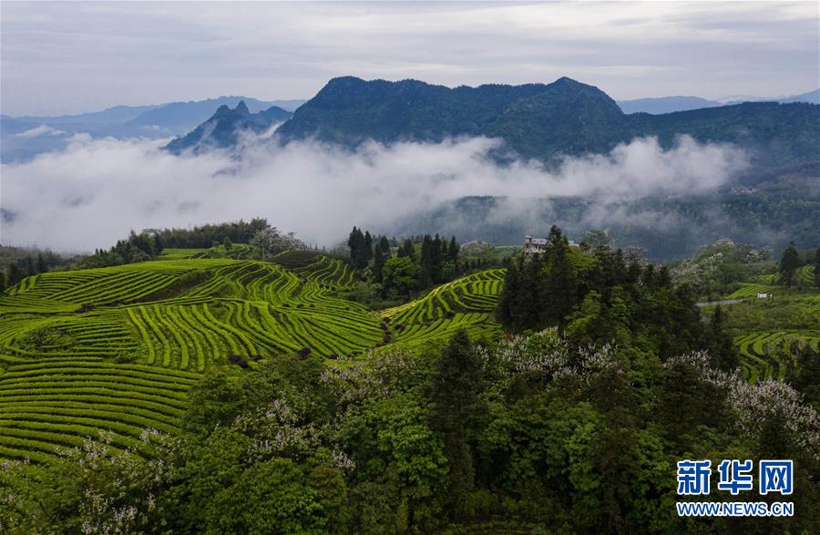 俯瞰鹿鳴茶海一角(4月28日無人機照片)。四川省珙縣的鹿鳴茶海,常年云霧繚繞,茶壟依山分布,美不勝收。新華社記者江宏景攝