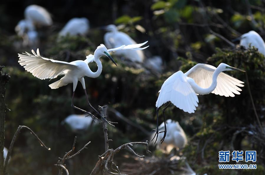 白鷺在位于鄱陽湖畔的南昌市象山森林公園內(nèi)棲息(4月27日攝)。近日,在江西省南昌市新建區(qū)象山森林公園內(nèi),已安家筑巢的大批白鷺進(jìn)入繁殖旺季。在夕陽的照耀下,白鷺時而翩翩起舞,時而展翅盤旋,構(gòu)成一幅美麗的自然生態(tài)畫卷。新華社記者萬象攝