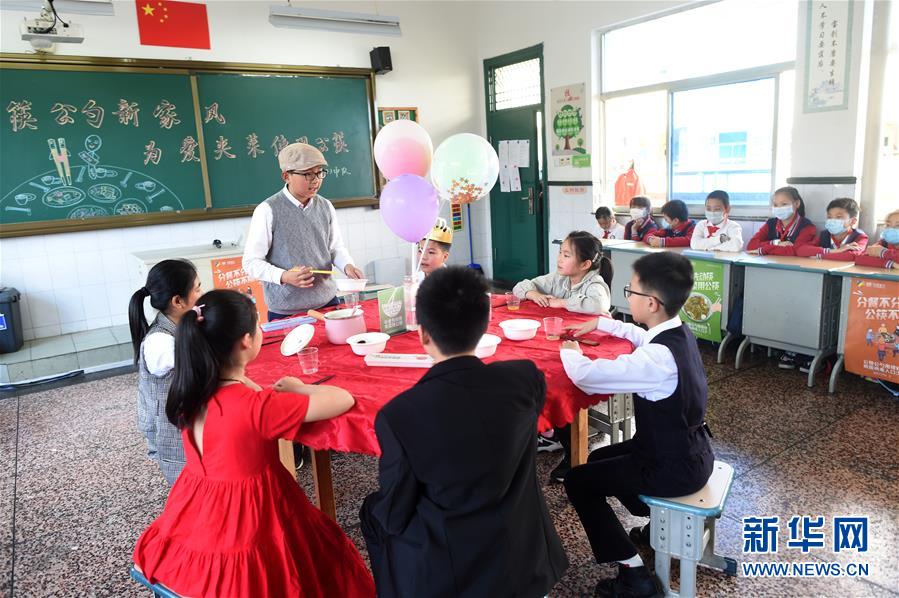 4月30日,諸暨市暨陽小學(xué)五年級4班學(xué)生在表演家庭用餐時使用公筷公勺的情景劇。當(dāng)日,浙江省諸暨市暨陽小學(xué)五年級4班開展“公筷公勺新家風(fēng)”主題班會活動,通過海報設(shè)計、情景劇表演等強化孩子們使用公筷公勺的意識,倡導(dǎo)文明用餐。新華社記者 韓傳號 攝