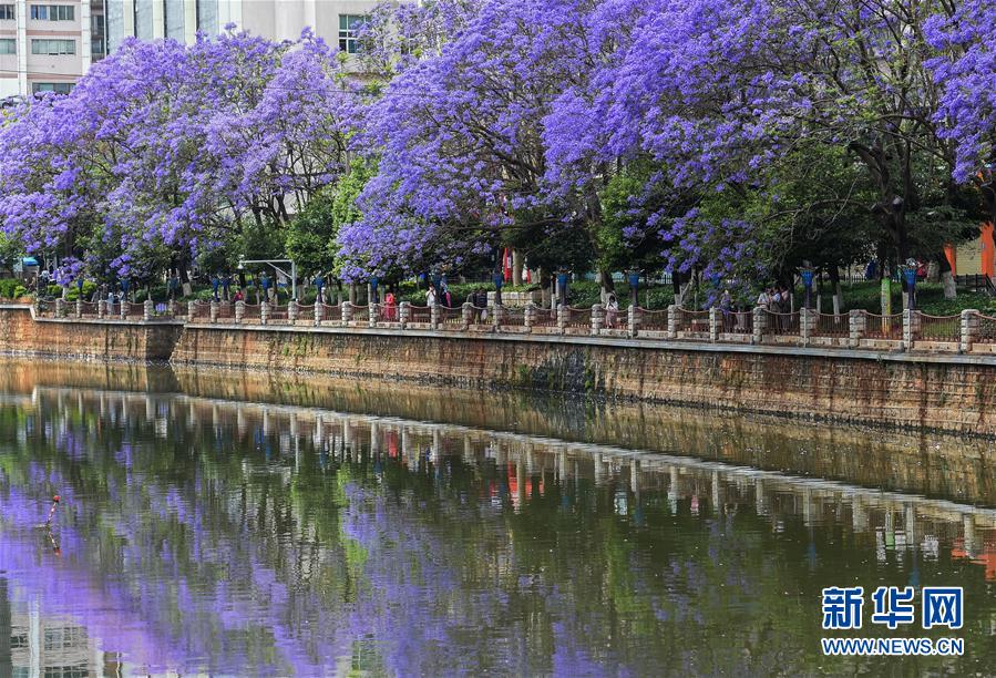 這是5月2日在昆明市桃源街拍攝的藍(lán)花楹。近日,云南省昆明市部分街區(qū)的藍(lán)花楹競相開放,為春城增添靚麗風(fēng)景。新華社記者藺以光攝