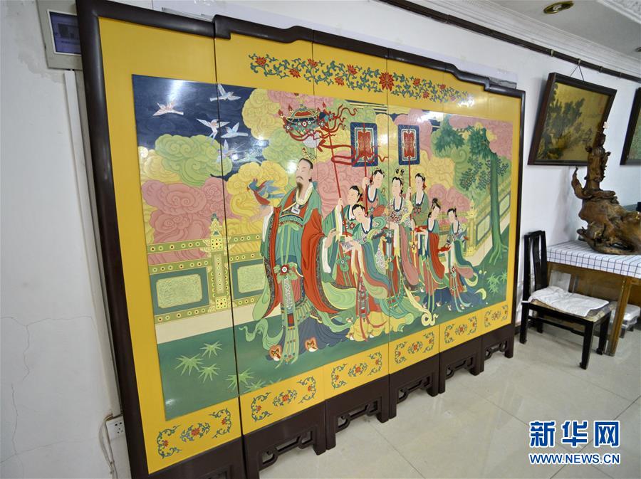 5月4日拍攝的采用金漆鑲嵌彩繪工藝繪制完成的承恩寺壁畫屏風(fēng)《帝后放飛圖》。新華社記者 李欣 攝