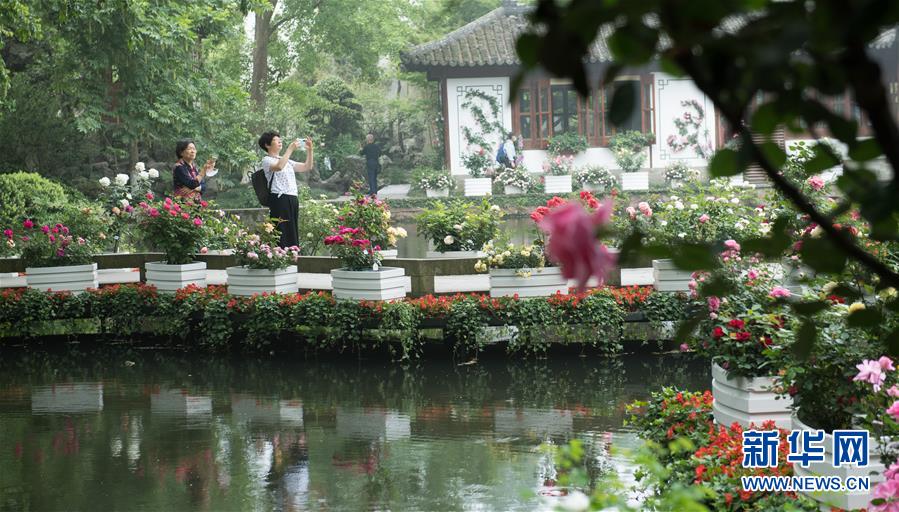 5月5日,游客在西湖畔的郭莊觀看月季花展?!拔逡弧逼陂g,第八屆杭州西湖月季花精品展在杭州西子湖畔舉行,展出國內(nèi)外700余個月季品種。新華社記者翁忻旸攝