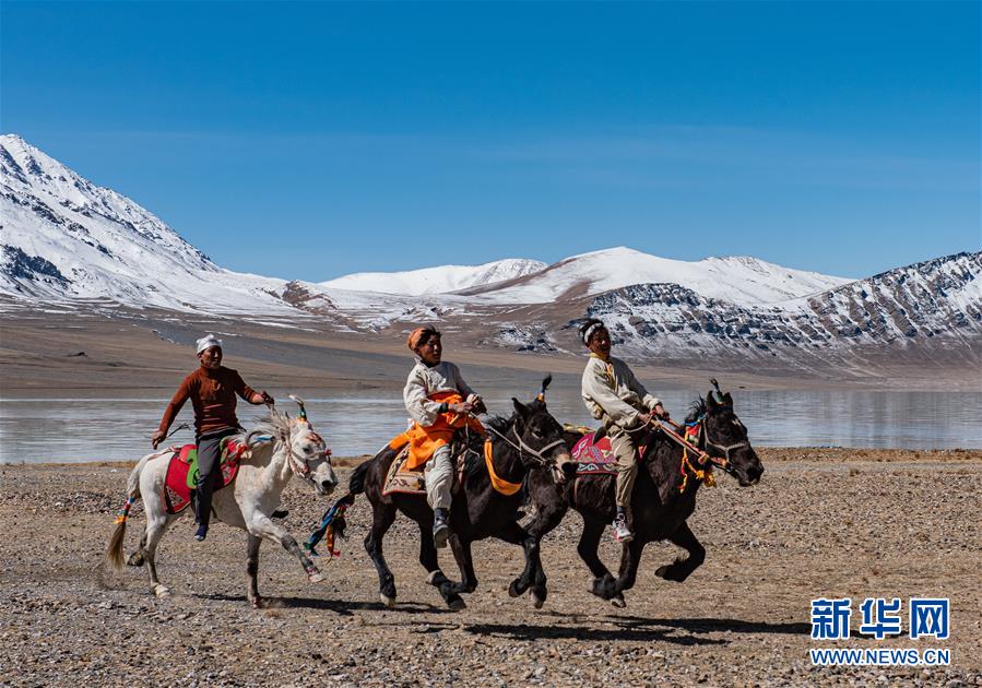 這是4月30日在西藏那曲市尼瑪縣當穹錯旁拍攝的春耕賽馬活動。新華社記者侯捷攝