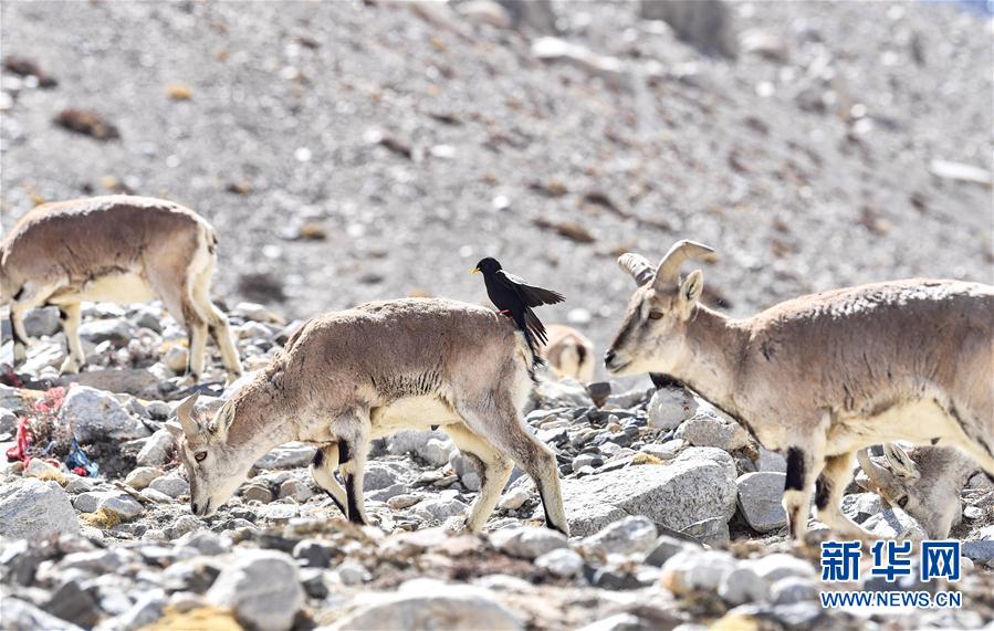 一只黃嘴山鴉停留在巖羊身上(5月8日攝)。當(dāng)日,一群巖羊在珠峰大本營(yíng)周圍覓食,黃嘴山鴉飛到巖羊身上停留,構(gòu)成一幅幅生動(dòng)有趣的雪域圖畫。新華社記者晉美多吉攝