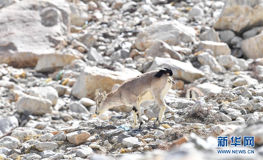 黃嘴山鴉停在巖羊背上(5月8日攝)。當日,一群巖羊在珠峰大本營周圍覓食,黃嘴山鴉飛到巖羊身上停留,構(gòu)成一幅幅生動有趣的雪域圖畫。新華社記者普布扎西攝