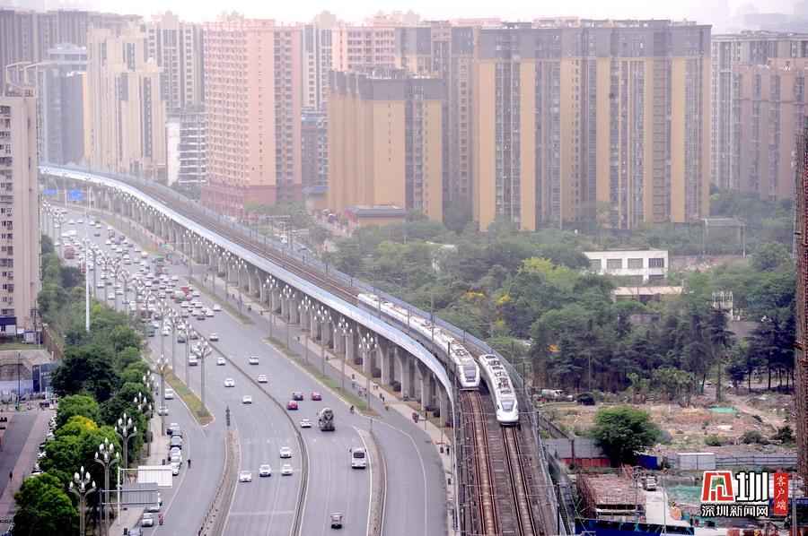 2020年5月11日,四川省成都市,動車運行在成灌鐵路上。隨著發(fā)展,鐵路沿線已是高樓林立。