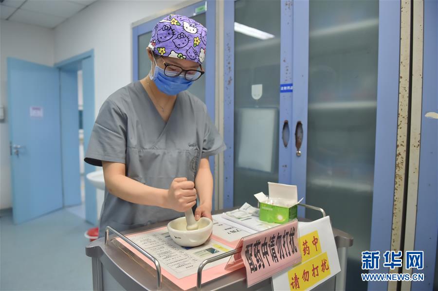 5月11日,在北京地壇醫(yī)院感染二科護士站,一名護士為不方便服藥的病人研磨藥片。北京地壇醫(yī)院是北京市收治新冠肺炎患者的定點醫(yī)院之一,醫(yī)院的醫(yī)護人員一直奮戰(zhàn)在抗擊疫情的一線。在國際護士節(jié)前夕,記者前往北京地壇醫(yī)院,記錄下抗疫一線護士的日常工作狀態(tài)。新華社記者彭子洋攝