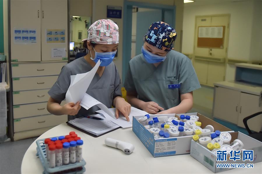 5月11日,在北京地壇醫(yī)院感染二科護(hù)士站,白班護(hù)士高齊(右)與晚班護(hù)士劉印懷交接工作。北京地壇醫(yī)院是北京市收治新冠肺炎患者的定點(diǎn)醫(yī)院之一,醫(yī)院的醫(yī)護(hù)人員一直奮戰(zhàn)在抗擊疫情的一線。在國(guó)際護(hù)士節(jié)前夕,記者前往北京地壇醫(yī)院,記錄下抗疫一線護(hù)士的日常工作狀態(tài)。新華社記者彭子洋攝