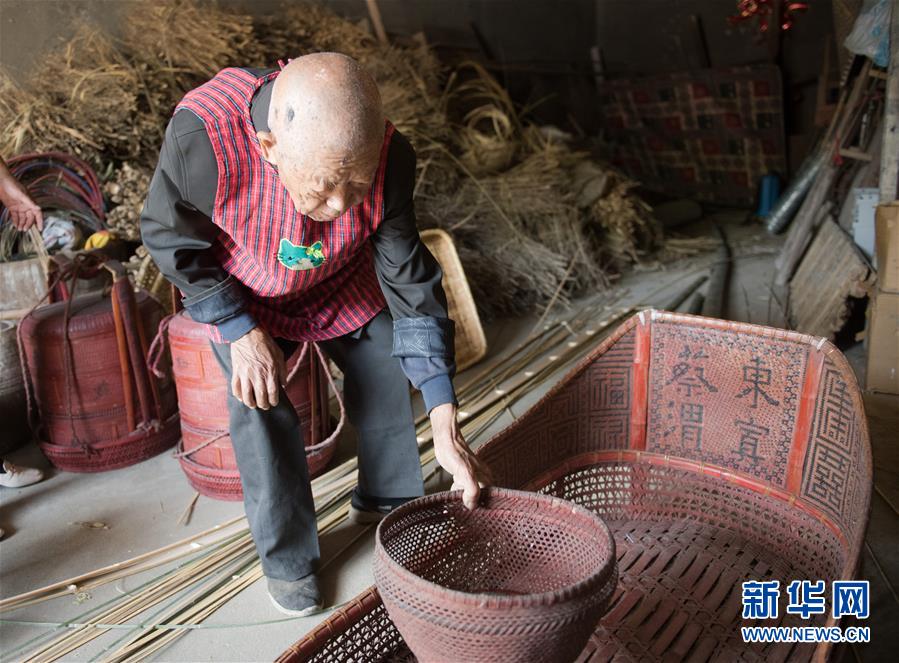 5月12日,浙江諸暨龍溪村的百歲老人蔡渭東在家中展示自己早年做的農村婚事用的篾器。浙江諸暨東和鄉(xiāng)龍溪村有一位102歲的老人蔡渭東,他從12歲開始拜師學藝,做了90年的篾匠,如今依然耳聰目明,每天堅持編織篾器。蔡渭東老人說他舍不得丟掉這份老手藝,也希望年輕人能傳承下去。新華社記者翁忻旸攝