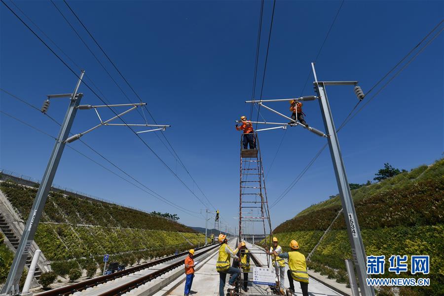 5月12日,中國(guó)鐵路上海局集團(tuán)公司上海高鐵維修段的技術(shù)人員在商合杭高鐵浙江湖州段調(diào)整接觸網(wǎng)導(dǎo)線。近日,商合杭高鐵合肥至湖州段聯(lián)調(diào)聯(lián)試正有條不紊進(jìn)行中。中國(guó)鐵路上海局集團(tuán)公司上海高鐵維修段抽調(diào)49名精兵強(qiáng)將,持續(xù)對(duì)管轄范圍內(nèi)的高鐵線路、信號(hào)、接觸網(wǎng)線進(jìn)行調(diào)試,為下一階段打下基礎(chǔ)。據(jù)了解,商合杭高鐵合湖段聯(lián)調(diào)聯(lián)試之后將轉(zhuǎn)入運(yùn)行試驗(yàn)階段,驗(yàn)收合格并通過(guò)安全評(píng)估后,力爭(zhēng)6月底具備開(kāi)通運(yùn)營(yíng)條件。新華社記者黃宗治攝