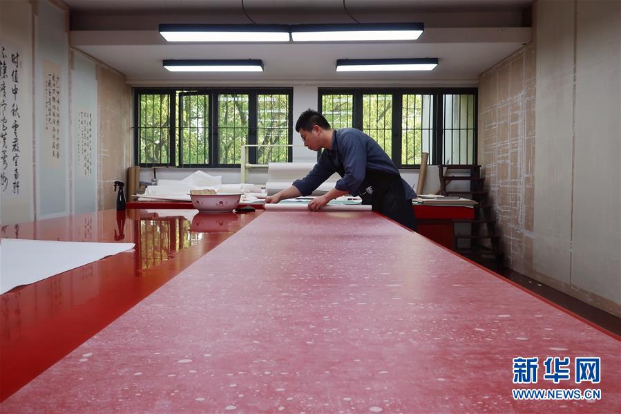 5月13日,古籍修復(fù)師在對(duì)書(shū)畫(huà)作品進(jìn)行裝裱操作。天一閣藏品修復(fù)部目前有修復(fù)師14人,每年約修復(fù)古籍14000余頁(yè)。據(jù)介紹,修復(fù)一冊(cè)古籍通常需要1至2個(gè)月,有的甚至需要1年以上。新華社記者鄭夢(mèng)雨攝