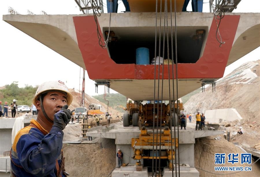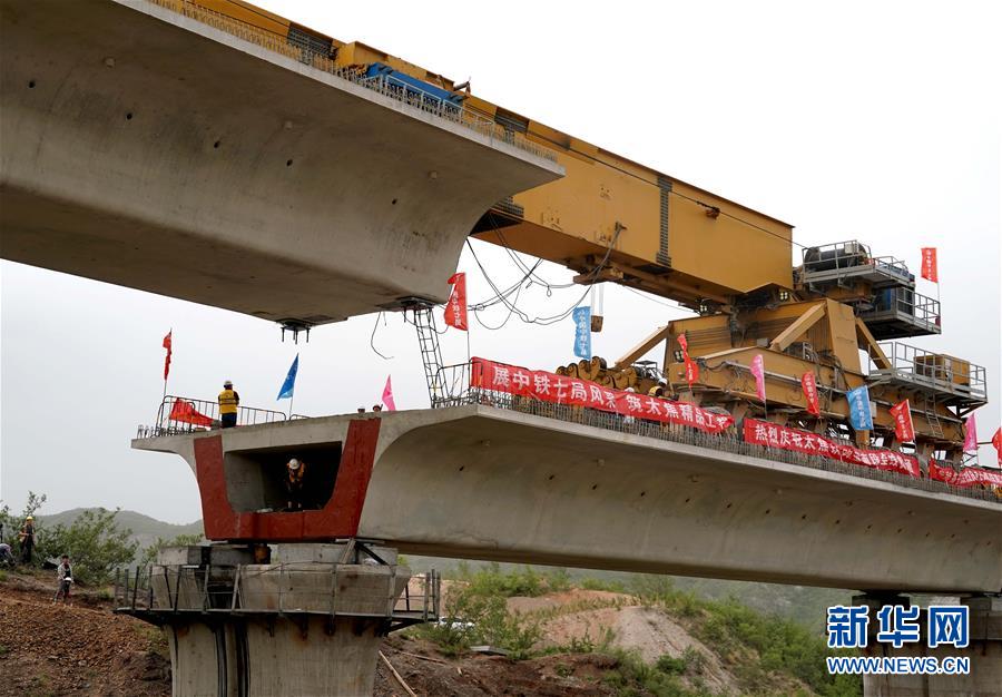 5月13日,運(yùn)架一體機(jī)在位于河南焦作的施工現(xiàn)場進(jìn)行架梁作業(yè)。 當(dāng)日,隨著最后一榀長24米、重552噸的箱梁架設(shè)就位,太焦高鐵全線橋梁架設(shè)完成。從山西太原到河南焦作的太焦高鐵是國家規(guī)劃建設(shè)的“八縱八橫”高速鐵路網(wǎng)的重要組成部分,計(jì)劃2020年底建成通車。 新華社記者李安攝