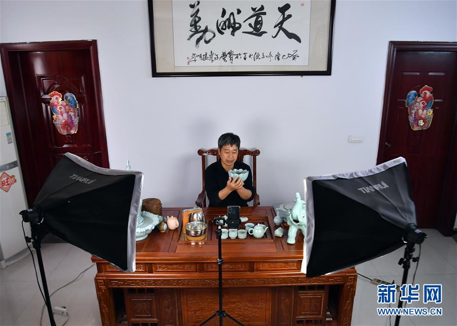 5月13日,寶豐縣大營鎮(zhèn)的汝瓷藝人王國奇在拍攝汝瓷產品短視頻。新華社記者李嘉南攝