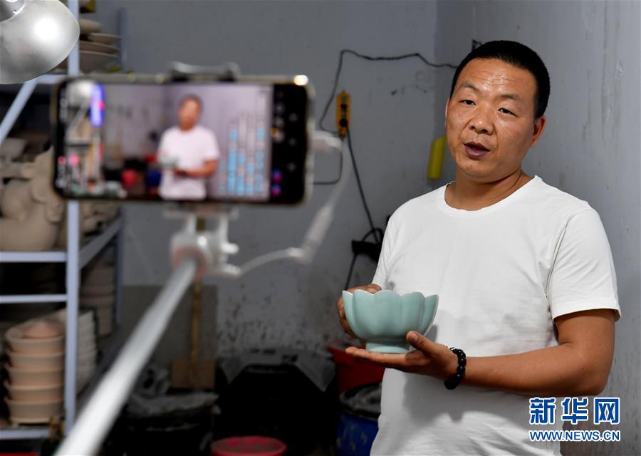 5月13日,寶豐縣大營鎮(zhèn)的汝瓷藝人宋召冰在汝瓷作坊直播介紹汝瓷產(chǎn)品。新華社記者李嘉南攝