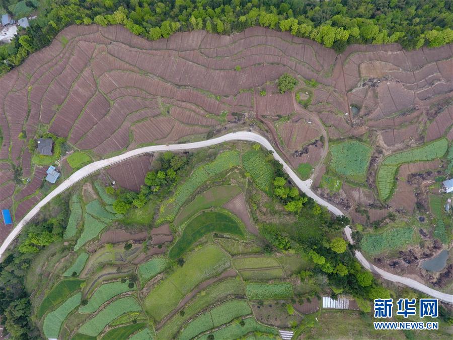 這是4月1日拍攝的龍臺村部分土地(無人機照片)。圖中上半部分為已種上中藥材的新整土地,下半部分為該村種植的傳統(tǒng)作物。新華社記者劉坤攝