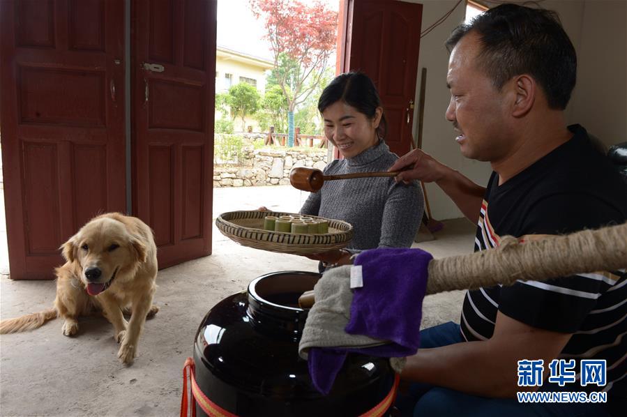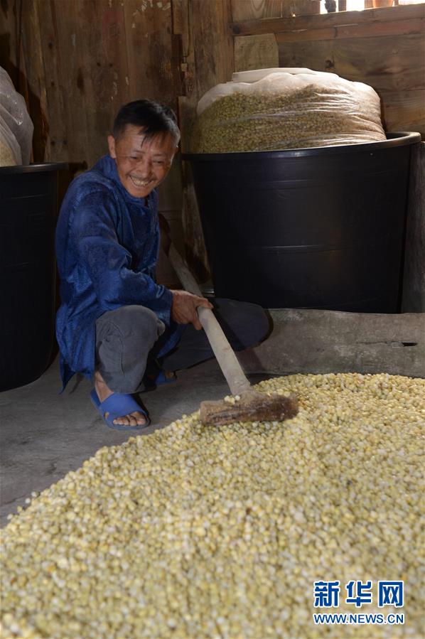 5月14日,在貴州省畢節(jié)市百里杜鵑管理區(qū)黃泥鄉(xiāng)龍?zhí)链逡患揖谱鞣唬迕駥τ衩走M(jìn)行發(fā)酵。貴州省畢節(jié)市百里杜鵑管理區(qū)黃泥鄉(xiāng)龍?zhí)链宓凝執(zhí)凉啪疲颡毺氐墓欧ㄡ劸萍夹g(shù),口感獨特而遠(yuǎn)近聞名。全村有釀酒戶142戶,年產(chǎn)量達(dá)45萬多公斤,龍?zhí)凉啪七h(yuǎn)銷重慶、廣東、浙江等地,龍?zhí)凉啪埔殉蔀辇執(zhí)寥嗽鍪盏闹匾獊碓?。新華社記者楊楹攝