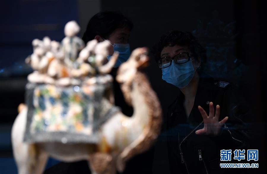 游客在陜西歷史博物館參觀唐三彩駱駝?shì)d樂(lè)俑(3月25日攝)。新華社記者 李一博 攝