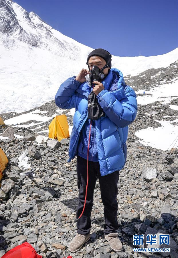 5月18日,國測一大隊(duì)沖頂隊(duì)員王偉在練習(xí)使用氧氣面罩。新華社特約記者扎西次仁攝