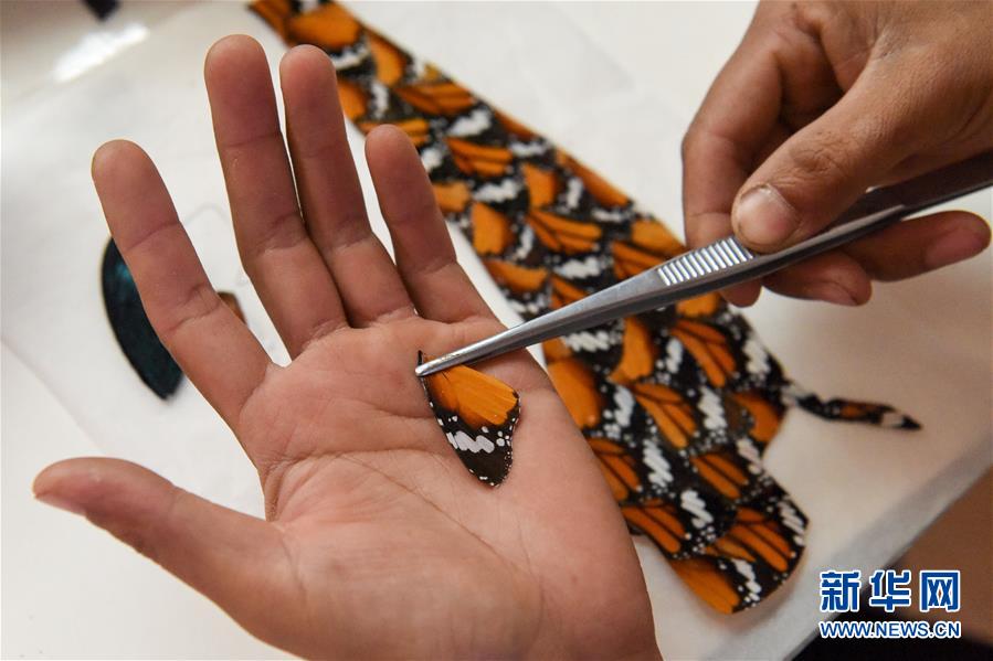 在吉木薩爾縣七彩蝶園,關(guān)富云在制作蝶翅畫(huà)(5月14日攝)。新華社記者丁磊攝