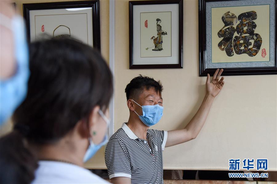 在吉木薩爾縣七彩蝶園,關(guān)富云向游客介紹蝶翅畫作品(5月14日攝)。新華社記者丁磊攝