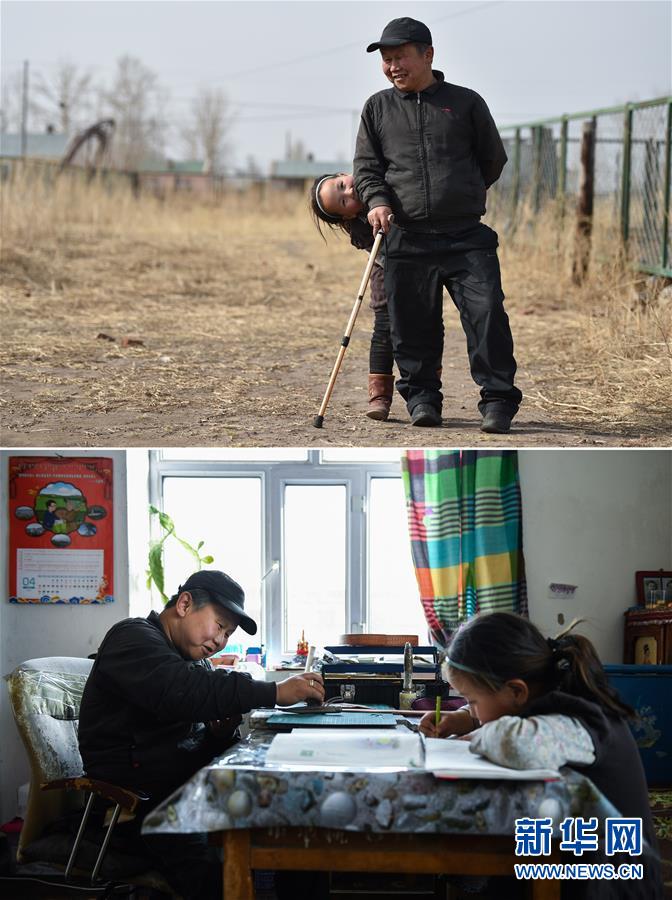 拼版照片上圖:在錫尼河鎮(zhèn)的出租房外,米格木爾(前)和女兒南吉樂瑪一起玩耍;下圖:在錫尼河鎮(zhèn)的出租房內(nèi),米格木爾在進行皮雕,女兒南吉樂瑪在溫習(xí)功課(照片均攝于4月15日)。2016年,家住內(nèi)蒙古鄂溫克族自治旗錫尼河鎮(zhèn)孟根礎(chǔ)魯嘎查的米格木爾因為缺失勞動能力成了建檔立卡貧困戶。獨自撫養(yǎng)女兒的他為了女兒上學(xué)離開了牧區(qū)來到鎮(zhèn)上租房陪讀,生活的壓力讓米格木爾犯了難。2018年春天,他通過當?shù)孛褡逦幕a(chǎn)業(yè)創(chuàng)業(yè)園舉辦的皮雕手藝培訓(xùn),讓他居家賺錢、陪讀兩不誤,逐步實現(xiàn)穩(wěn)定脫貧。2020年4月,我國第一個成立的少數(shù)民族自治區(qū)——內(nèi)蒙古自治區(qū)宣告全面脫貧“摘帽”。黨的十八大以來,我們堅持以人民為中心的發(fā)展思想,明確了到2020年我國現(xiàn)行標準下農(nóng)村貧困人口實現(xiàn)脫貧、貧困縣全部摘帽、解決區(qū)域性整體貧困的目標任務(wù)。目前看,脫貧進度符合預(yù)期,成就舉世矚目。這些成績的取得,凝聚了全黨全國各族人民智慧和心血,是廣大干部群眾扎扎實實干出來的。脫貧摘帽不是終點,而是新生活、新奮斗的起點。新華社記者劉磊攝