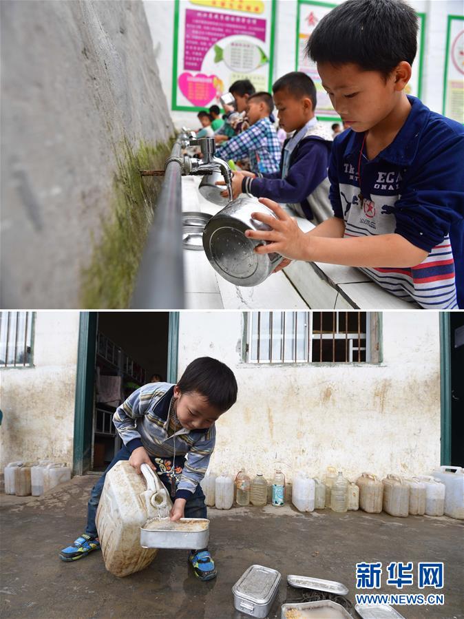 這是一張拼版照片。上圖:在大化瑤族自治縣板升鄉(xiāng)八好小學(xué),同學(xué)們?cè)谟萌赐耄?019年5月7日攝)。下圖:八好小學(xué)的同學(xué)們用儲(chǔ)備在水桶里的雨水淘米煮飯(2014年11月24日攝)。八好小學(xué)有400多名學(xué)生,曾僅有一個(gè)不足100立方米的水柜,用于收集儲(chǔ)存樓頂?shù)挠晁?,學(xué)生需定期定量用水。遇到長(zhǎng)時(shí)間不下雨,學(xué)校需要到鄉(xiāng)政府所在地運(yùn)水。如今,學(xué)校修建了5個(gè)大水柜,并從兩公里外引泉水到校園,“飲水難”問(wèn)題得到解決。新華社記者黃孝邦攝