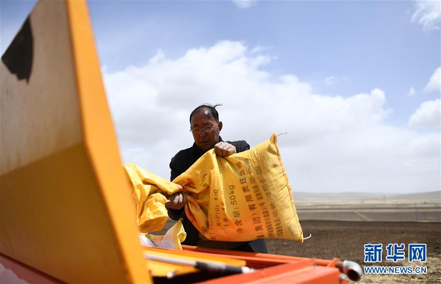 在青海省海北藏族自治州海晏縣青海湖鄉(xiāng)同寶村,者成倉(cāng)準(zhǔn)備播種(5月13日攝)。新華社記者張宏祥攝