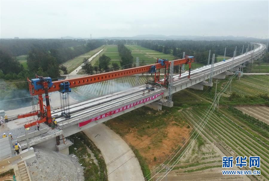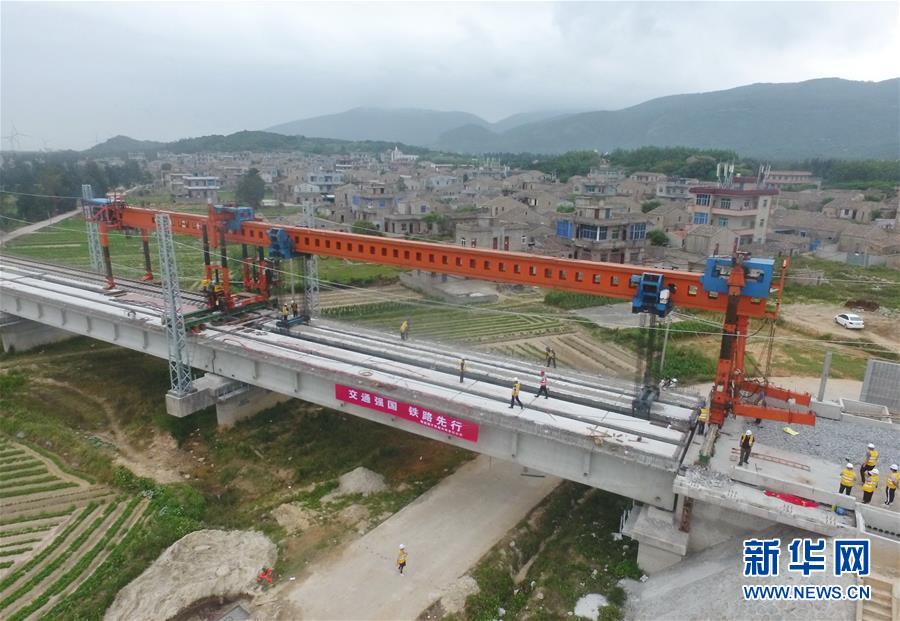 5月20日,福平鐵路洋中特大橋最后一片T型梁在架設(shè)中。新華社記者林善傳攝