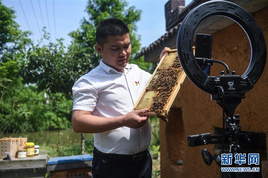 5月20日,長興縣林城鎮(zhèn)畎橋村的意蜂蜂業(yè)幫扶基地內,養(yǎng)蜂能手邱凱在進行網(wǎng)上直播,介紹當?shù)孛鄯漯B(yǎng)殖特色及相關蜂產(chǎn)品。新華社記者徐昱攝