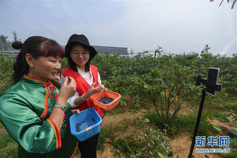 5月20日,長(zhǎng)興縣林城鎮(zhèn)上獅村的藍(lán)莓種植幫扶基地內(nèi),青年志愿者與種植戶通過(guò)手機(jī)直播藍(lán)莓的采摘,并介紹當(dāng)?shù)厮{(lán)莓生長(zhǎng)環(huán)境和品質(zhì),進(jìn)行網(wǎng)上銷售。新華社記者徐昱攝