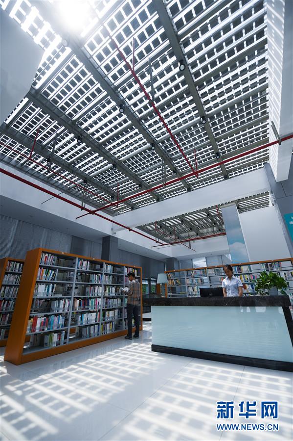 5月21日,市民在新能源小鎮(zhèn)“城市客廳”的圖書(shū)館內(nèi)看書(shū)。該圖書(shū)館頂部的光伏發(fā)電板可以隨時(shí)調(diào)整角度和開(kāi)合,進(jìn)而控制室內(nèi)采光。新華社記者徐昱攝