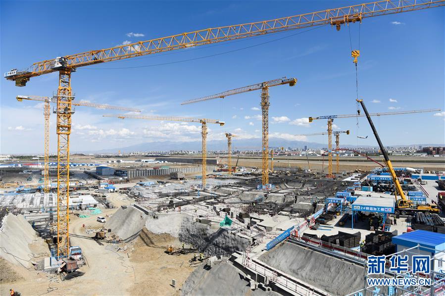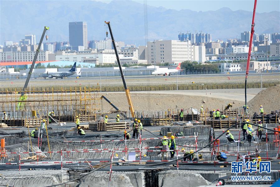 5月23日,工人在烏魯木齊機場改擴建工程施工現場作業(yè)。新華社記者丁磊攝