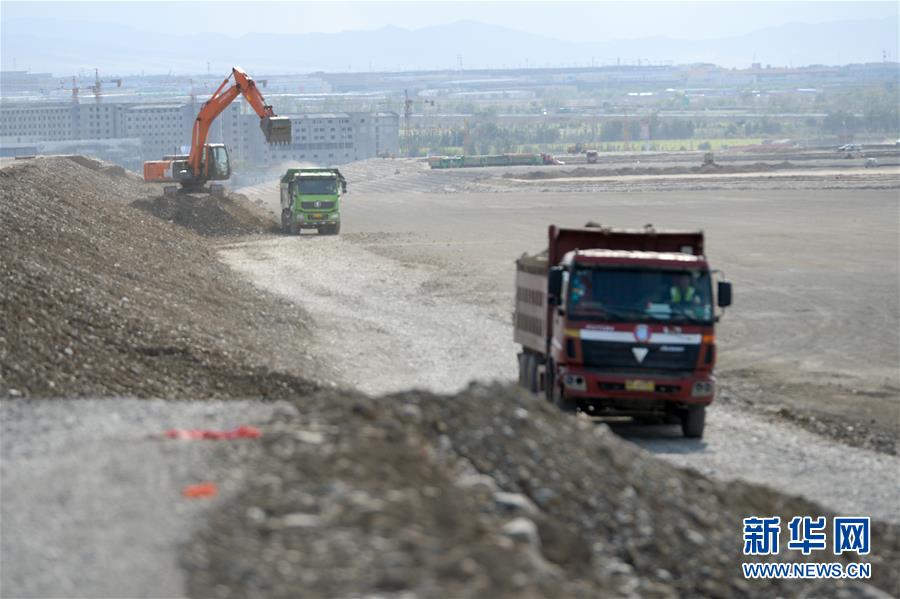 5月23日,在烏魯木齊機場改擴建工程施工現場,施工車輛在飛行區(qū)進行土方回填作業(yè)。新華社記者丁磊攝