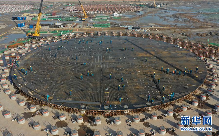 5月23日,工人在唐山市曹妃甸區(qū)LNG項(xiàng)目第一階段工程儲(chǔ)罐建設(shè)工地施工(無人機(jī)照片)。新華社記者楊世堯攝