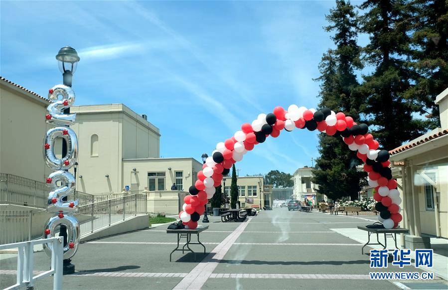 這是5月22日在美國加州北部圣馬特奧縣伯靈格姆高中拍攝的歡迎畢業(yè)生的氣球拱門。