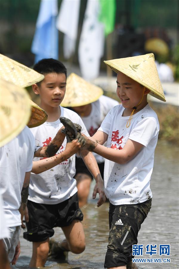 5月24日,小朋友在稻田里捉魚(yú),體驗(yàn)農(nóng)事。當(dāng)日,十余名小朋友在家長(zhǎng)的帶領(lǐng)下來(lái)到浙江省湖州市吳興區(qū)八里店鎮(zhèn)尹家圩糧油植保農(nóng)機(jī)專(zhuān)業(yè)合作社的稻田中,參加親子插秧、稻田捉魚(yú)等農(nóng)事體驗(yàn)活動(dòng)。新華社記者黃宗治攝