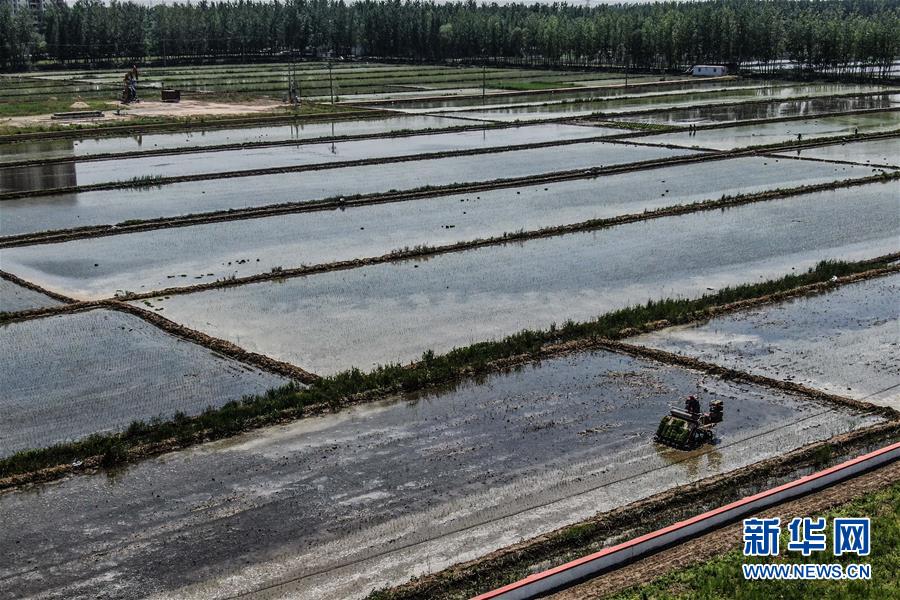 5月24日,盤(pán)錦市大洼區(qū)的農(nóng)民在駕駛插秧機(jī)插秧(無(wú)人機(jī)照片)。新華社記者潘昱龍攝