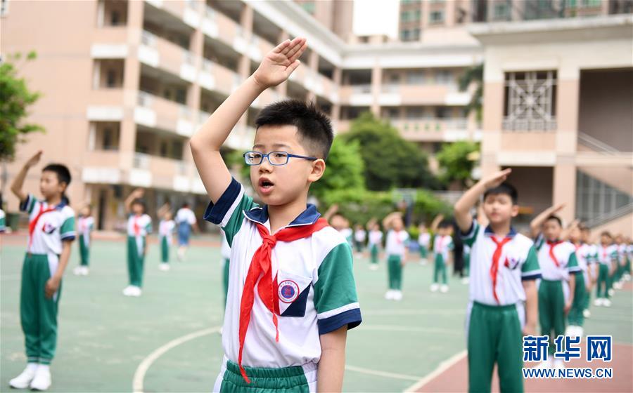 5月25日,廣州市荔灣區(qū)蔣光鼐紀念小學的學生在參加升國旗唱國歌儀式。當日,廣州市各小學一至三年級學生正式開學復課。至此,廣州市中小學各年級已全部開學復課。新華社記者盧漢欣攝