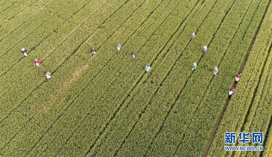 5月26日,農(nóng)民在內(nèi)丘縣東龐前街村麥田清理雜麥(無(wú)人機(jī)照片)。夏日時(shí)節(jié),河北省邢臺(tái)市內(nèi)丘縣農(nóng)民搶抓農(nóng)時(shí)開(kāi)展麥田后期管理,為小麥增產(chǎn)豐收打好基礎(chǔ)。新華社記者朱旭東攝