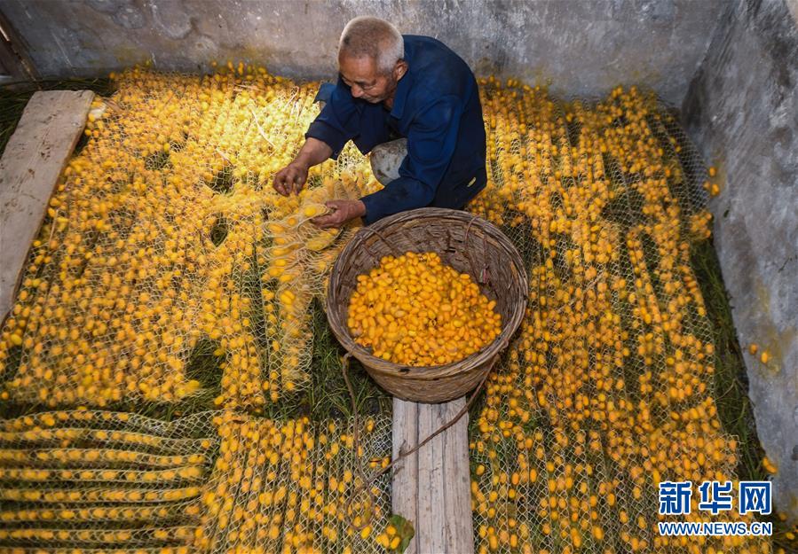 5月27日,桐鄉(xiāng)市鳳鳴街道建勝村70歲的村民宋柏明在收獲“黃金繭”。他今年在桐鄉(xiāng)興民蠶業(yè)專業(yè)合作社的指導下首次養(yǎng)3張黃金蠶繭種,收獲“黃金繭”近400斤,比往年同期增收1500元。近期,蠶桑之鄉(xiāng)浙江省桐鄉(xiāng)市的蠶農們迎來了蠶繭豐收的季節(jié),其中新品種“黃金繭”的增收效果尤其明顯。據介紹,與普通蠶絲相比,色澤金黃的黃金蠶絲中葉黃素含量高,抗菌效果更好,深受市場青睞。2020年春季,浙江省桐鄉(xiāng)市共計發(fā)放黃金蠶繭種1225張,產量預計75噸,總產值近300萬元,較普通蠶繭增收約20%,成為當?shù)剞r業(yè)增收的亮點。浙江省桐鄉(xiāng)市是我國蠶桑的重要產地,“桐鄉(xiāng)蠶桑習俗”也被國務院列入第二批國家級非物質文化遺產名錄。新華社記者徐昱攝