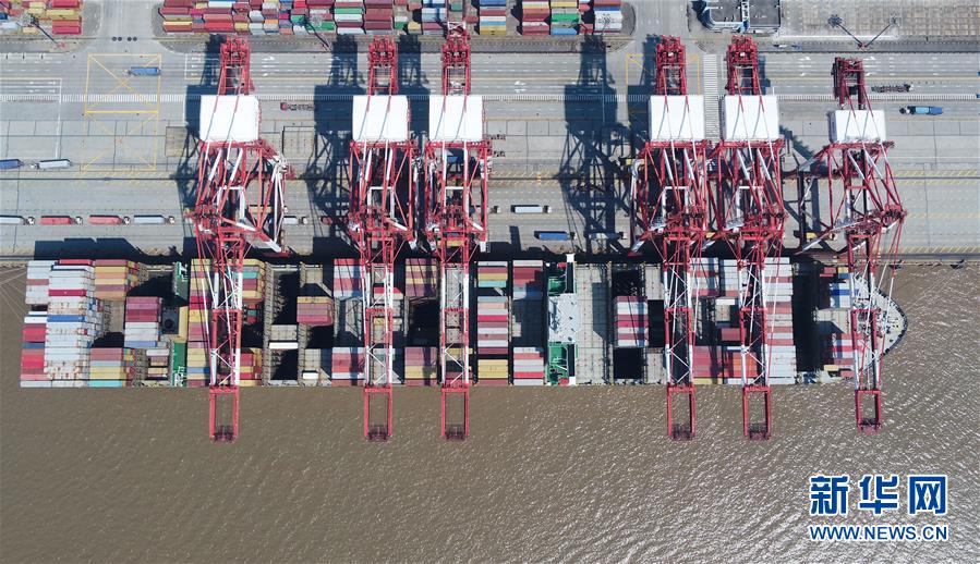 這是3月18日拍攝的上海洋山港集裝箱碼頭(無(wú)人機(jī)照片)。新華社記者丁汀攝
