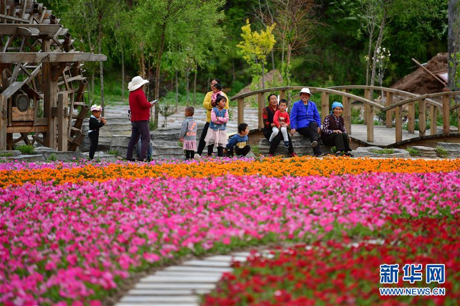 5月28日,村民在甘南藏族自治州臨潭縣八角鎮(zhèn)牙扎村的花海景點(diǎn)休憩。
