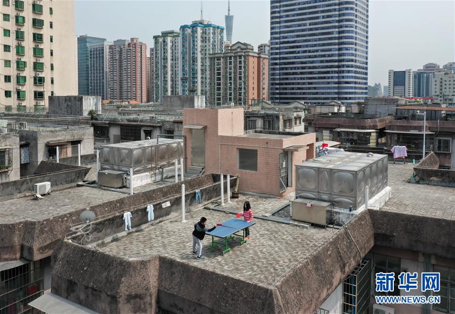 廣東廣州,兩名小朋友在樓頂上打乒乓球(4月10日攝)。新華社記者劉大偉攝