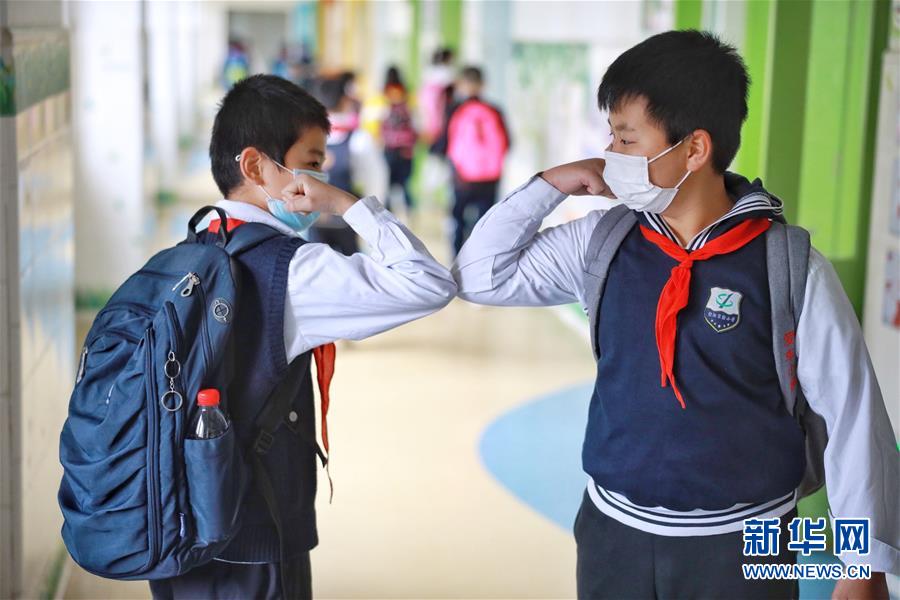 貴州貴陽(yáng),小學(xué)復(fù)課,兩名學(xué)生用“碰肘”的方式打招呼(5月25日攝)。新華社記者劉續(xù)攝