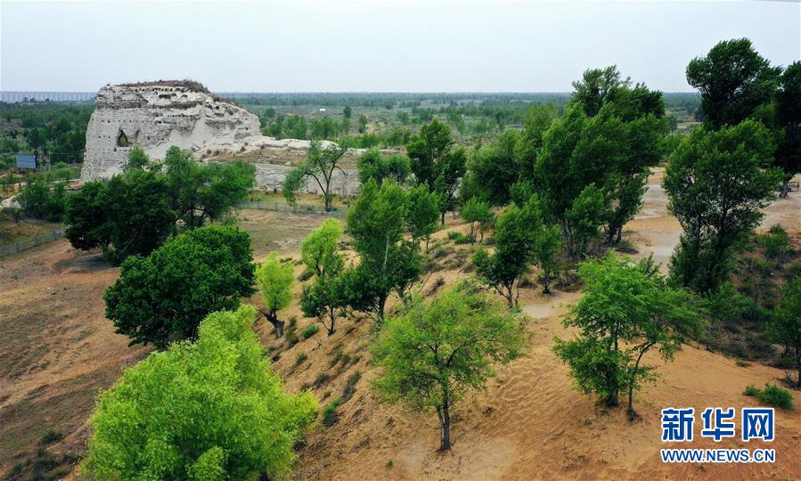 統(tǒng)萬城北接浩瀚的毛烏素沙漠,千余年來,隨著惡劣生態(tài)環(huán)境的影響,曾經(jīng)的城池遺存遭到風雨流沙侵蝕,一度掩埋于沙漠之下。如今,隨著當?shù)貛状舜罅χ紊?,生態(tài)環(huán)境得以明顯改善,統(tǒng)萬城遺址也隨之變成綠意盎然的“大漠名勝”。