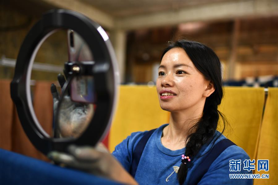 楊成蘭在用手機對侗族土布植物染色技藝進行網絡直播(5月28日攝)。