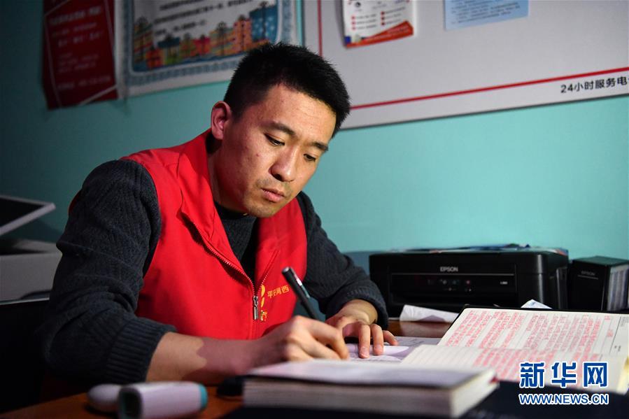 楊龍明在小區(qū)內的值班室整理下沉日記(6月1日攝)。新華社記者李然攝。