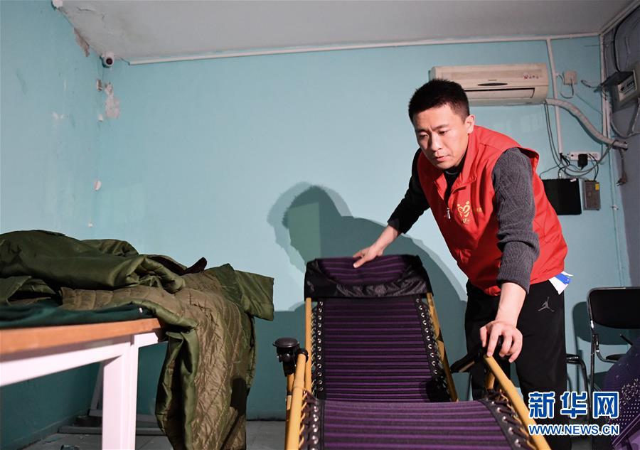 楊龍明在小區(qū)內的值班室整理躺椅,到后半夜的時候只能在這里稍微休息一下(6月1日攝)。新華社記者李然攝。