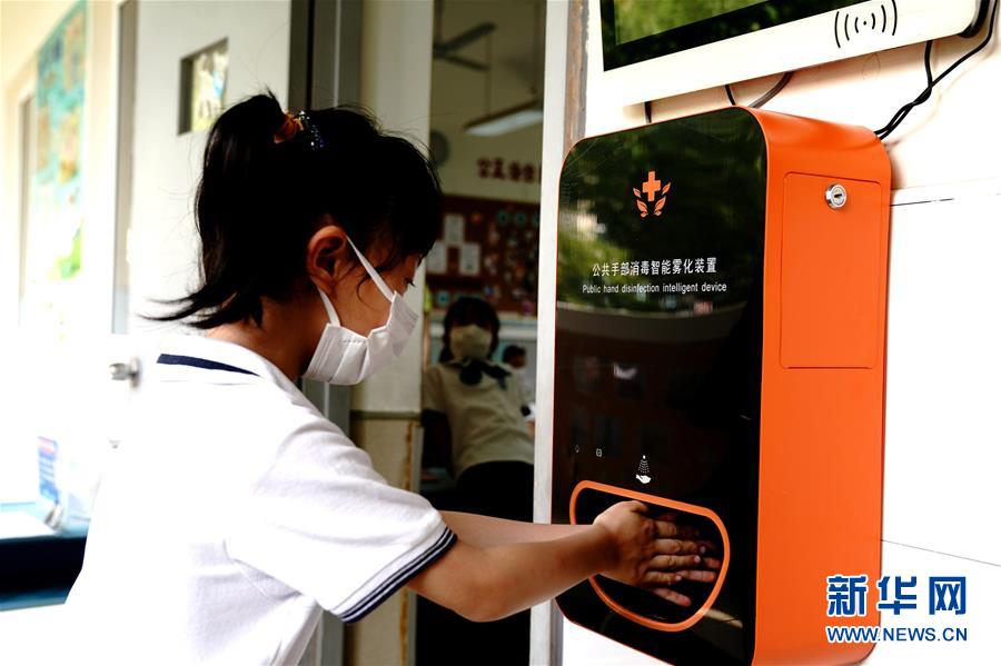 6月2日,上海閔行區(qū)鑫都小學,一名小學生使用手部消毒智能霧化裝置。當日,上海小學一、二、三年級學生返校開學。新華社記者張建松攝。