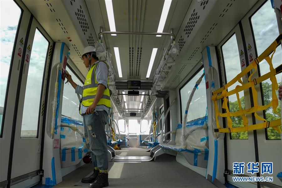 6月3日,工程技術(shù)人員在“云巴”車廂內(nèi)對(duì)安裝的電氣設(shè)備進(jìn)行調(diào)試。近日,重慶市首條“云巴”示范線項(xiàng)目在重慶璧山區(qū)正式亮相。此次發(fā)布的“云巴”采用電能驅(qū)動(dòng),具有轉(zhuǎn)彎半徑小、爬坡能力強(qiáng)、噪音低、安全性高、建設(shè)成本低、建造周期短等優(yōu)勢(shì),能為乘客提供更智能、舒適、便捷的出行體驗(yàn)。據(jù)介紹,璧山區(qū)“云巴”示范線項(xiàng)目自2019年8月開建,線路正線全長(zhǎng)15.4km,共設(shè)車站15座,預(yù)計(jì)2020年9月全線通車。新華社記者劉潺攝。